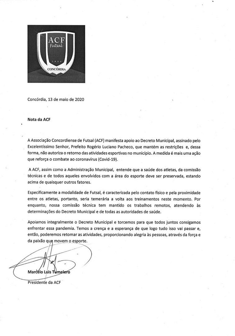 A Associação Concordiense de Futsal (ACF) manifesta apoio ao Decreto Municipal, assinado pelo Excelentíssimo Senhor, Prefeito Rogério Luciano Pacheco, que mantém as restrições e, dessa forma, não autoriza o retorno das atividades esportivas no município. A medida é mais uma ação que reforça o combate ao coronavírus (Covid-19).
